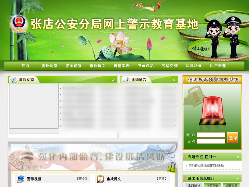 提供了廉政動(dòng)態(tài)、通知通告、警示視頻、廉政博文、典型案例、書(shū)畫(huà)作品、經(jīng)驗(yàn)交流、專(zhuān)項(xiàng)活動(dòng)、法律法規(guī)、重要文件等10個(gè)欄目,展示各種類(lèi)型的圖文警示信息。