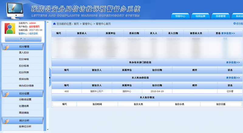 包含了扣分管理、扣分審核、扣分臺(tái)賬、跟進(jìn)措施、處理結(jié)果、統(tǒng)計(jì)分析、工作情況通報(bào)等功能